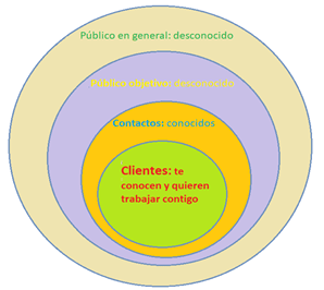 Dentro de este círculo indefinido de personas, están aquellas que pueden necesitar tus servicios. Este segundo grupo de personas integrarían lo que se denomina el público objetivo.